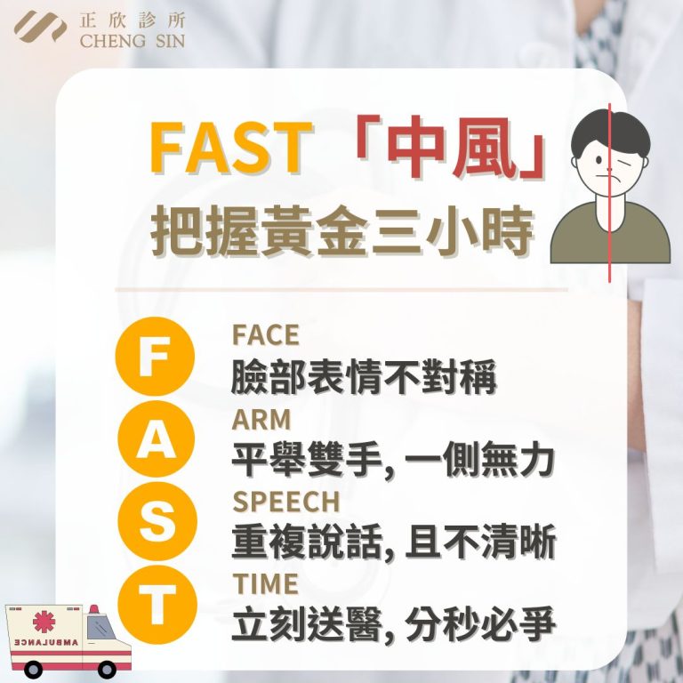 國民健康署呼籲民眾牢記中風口訣「FAST」,以辨識中風初期的重要症狀,並把握「急性中風搶救黃金3小時」盡快送醫爭取治療時間: