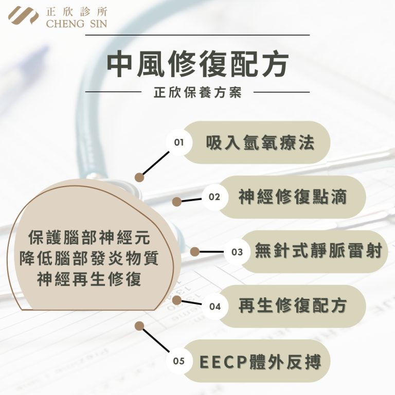 正欣診所提供專業的中風修復配方,「EECP體外反搏」、「經皮式靜脈雷射」、「吸入氫氧療程」、「神經修復點滴」、「再生修復配方」等項療程,能從「保護腦部神經元」、「降低腦部發炎物質」、「神經再生修復」等角度,來協助改善中風後的症狀,能協助您重拾身體的自主權。