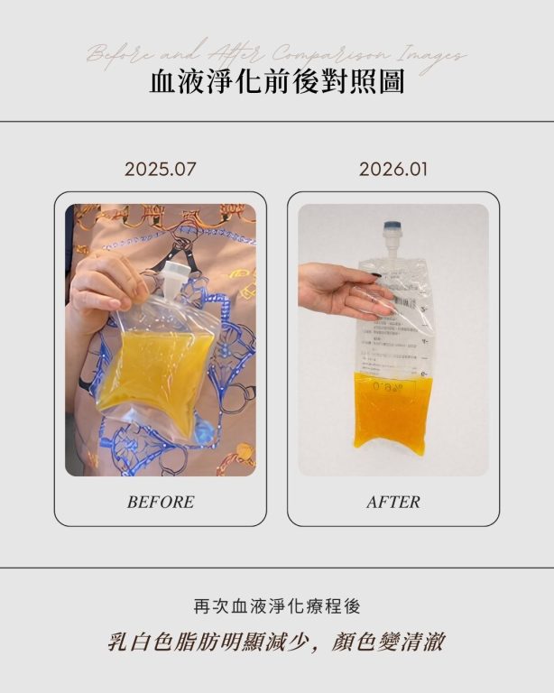 半年後再進行了一次血液淨化,發現血液中的乳白色脂肪明顯減少,顏色也變清澈,並呈現出明顯差異。
