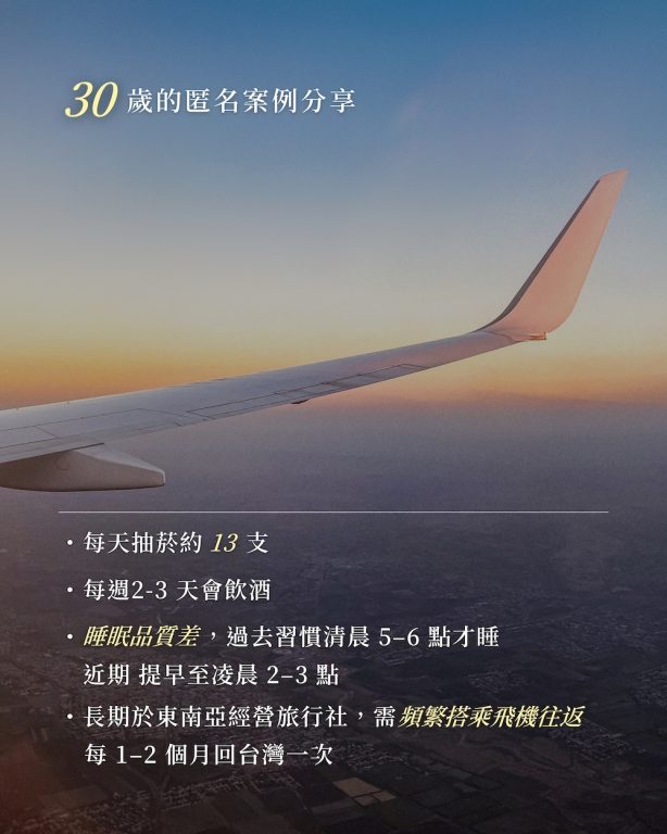 他的生活習慣並不算健康:每天平均抽菸 13 支、一週有 2–3 天會小酌,睡眠時間常常拖到凌晨,身體長期處在疲勞狀態。