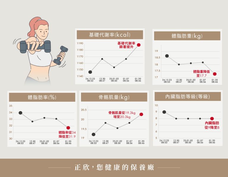 燃脂點滴促進代謝、桑拿幫助排毒與瑞倍適有效調控食慾,再搭配個人化營養建議,錢小姐的身體數據大幅改善。短短四週內,體脂肪從18.6公斤降至17.7公斤,骨骼肌量從19.3公斤增至20.3公斤,內臟脂肪由9降至8,體脂率從34.0%降至31.9%。此外,基礎代謝率也提高,讓她的身體機能全面優化。