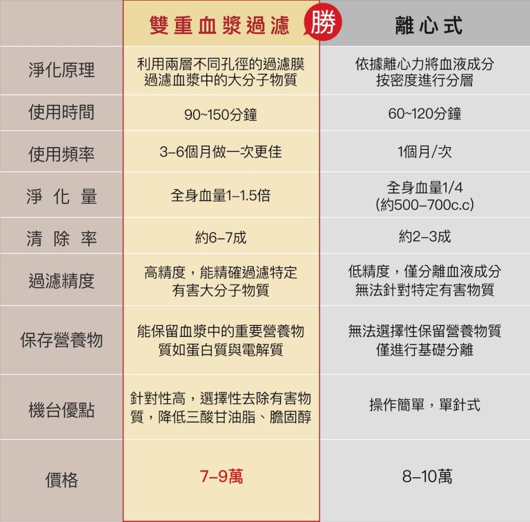 雙重血漿過濾術不同於傳統的離心技術或洗腎療程,其針對性更強,且專為預防健康設計,無需運用代用血漿、無需像洗腎一樣代替腎臟功能。